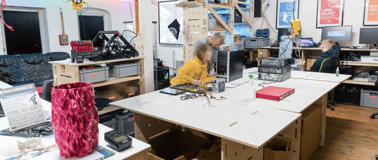 Dein Handy ist kaum drei Jahre alt, aber der Akku schwächelt und die Ladebuchse ist ausgeleiert? Dein Arduino-Projekt ist perfekt verkabelt, die Software läuft reibungslos, aber es passiert einfach nichts? Du wolltest schon immer mal selbst LEDs zum Blinken bringen? Dann bist du in unserer Elektronikwerkstatt genau richtig. Hier kannst du nicht nur Reparaturen an deinen Geräten vornehmen, sondern dich auch an Elektronikbausätzen oder dem Aufbau von Schaltungen versuchen – und bei Fragen sind wir natürlich für dich da.